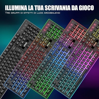 【Batteria Ricaricabile e Lunga Durata】 La tastiera è dotata di una batteria da 3000 mAh e il mouse è dotato di una batteria da 800 mAh. La lunga durata della batteria consente di utilizzarli ininterrottamente per 8 ore con la luce. La tastiera e il mouse sono dotati di funzioni intelligenti di risparmio energetico. Se non ci sono operazioni entro 2 minuti, andranno automaticamente a dormire, premere un tasto qualsiasi per svegliarli. Si prega di caricare 8 ore prima dell'uso.