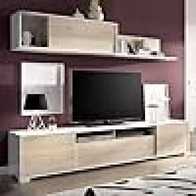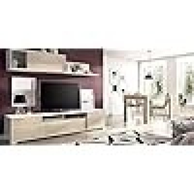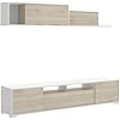 STRUTTURA E UTILIZZO - Mobile TV per salotto composto da una base porta televisione con un'anta a ribalta, due ante battenti, tre vani interni e due ripiani, un mobile pensile con un vano e un'anta a ribalta e una mensola - La scelta dei vari mobili che compongono questa composizione da salotto rendono il design di questo articolo d'arredamento moderno, funzionale e salvaspazio - Set soggiorno color rovere e bianco lucido, perfetto per arredare un salotto, sala da pranzo oppure una stanza open space