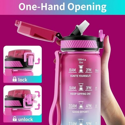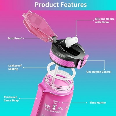 Excelente diseño: la botella de paja le permite beber cómodamente sin tener que revocar la botella. El diseño con la apertura a un solo toque le permite abrir la tapa con una mano para beber cómodamente. El cinturón resistente le permite llevar la botella 1L en cualquier ocasión. El diseño de boca ancha, junto con el cepillo de limpieza incluido, le ayuda a lavar fácilmente la botella.